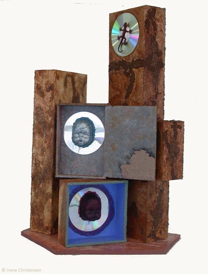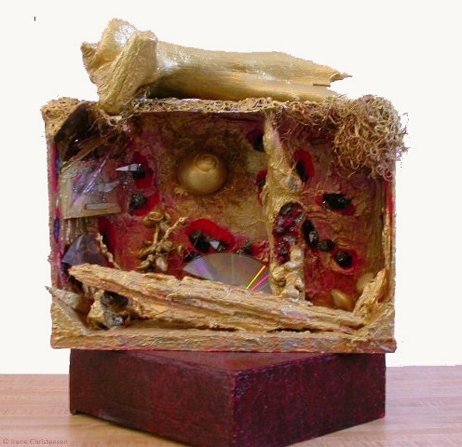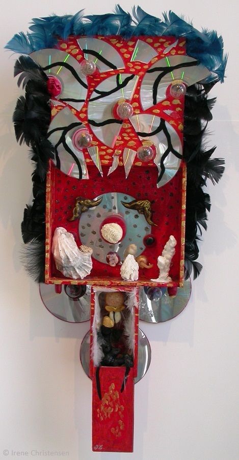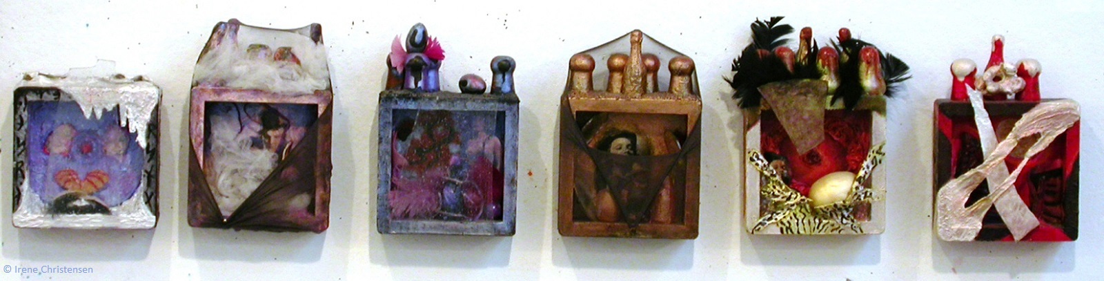 Blue Morning 11.5 x 6 x 1.5 mixed media box sculptureBraided Truths 34 x 12 x 3 mixed media box sculptureRed Red Raven 27 x 12 x 4 mixed media box sculptureScarlet Planet 10.5 x 5 x 2 mixed media box sculptureAelurus 30 x 6 x 3 mixed media box sculptureAnother Voice 8 x 18 mixed media box sculptureBlack Venus 24 x 14 x 4 mixed media box sculptureBlue Moon 11 x 11 x 8mixed media box sculptureCave 10 H x 8 x 7 mixed media box sculptureCybernated Dream 28 x 6 x 3 mixed media box sculptureEverglades Drops, detail of InstallationSanta Marlene 9 x 3.5 x 33 mixed media box sculptureOwl 16 x 12 x 4 mixed media box sculptureRoseate 17 x 9 x 7 mixed media box sculptureSpinning Continents 10.5 x 7.25 x 2.5 mixed media box sculptureSt. Jude 13.5 x 17 x 25 mixed media box sculptureUtopia Cave 13 x 13 x 6 mixed media box sculptureVenus World 14 x 13 x 10 mixed media box sculptureYear of the Red Mouth 18 x 21 x 3 mixed media box sculpture